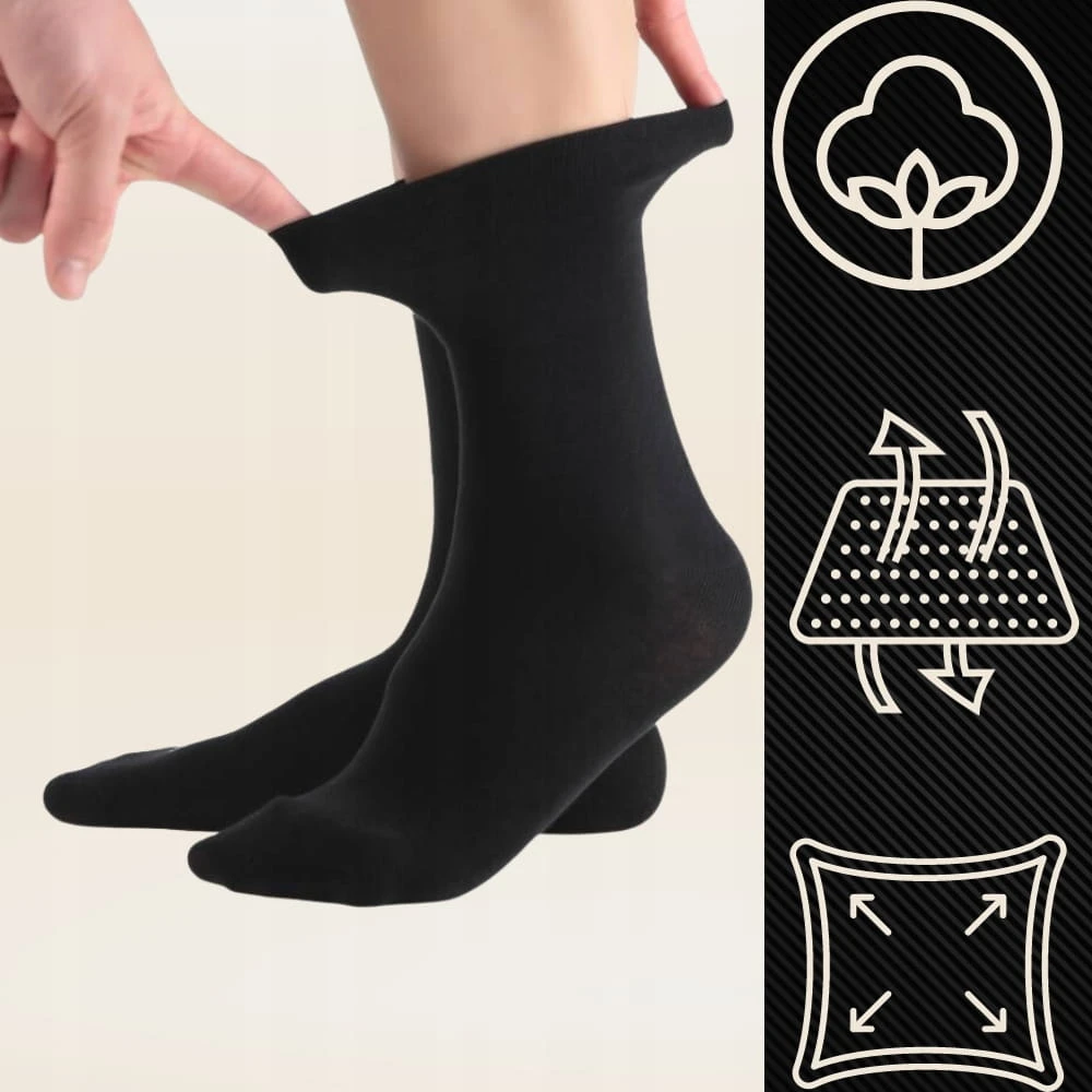 Skarpety klasyczne bezuciskowe wykonane są z miękkiej oraz przyjemnej w dotyku bawełny. Wzmocnienia na palcach i piętach zapobiegają nieprzyjemnym otarciom, ale też sprzyjają dłuższemu noszeniu skarpet. Posiadają delikatny i nieutrudniający przepływu krwi w kończynach ściągacz. Doceniany przez osoby mające styczność z problemami krążeniowymi.