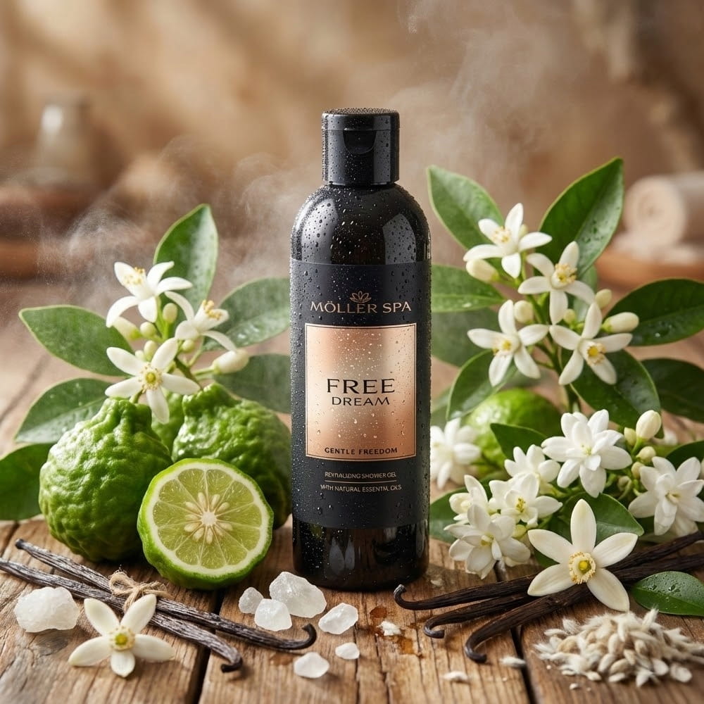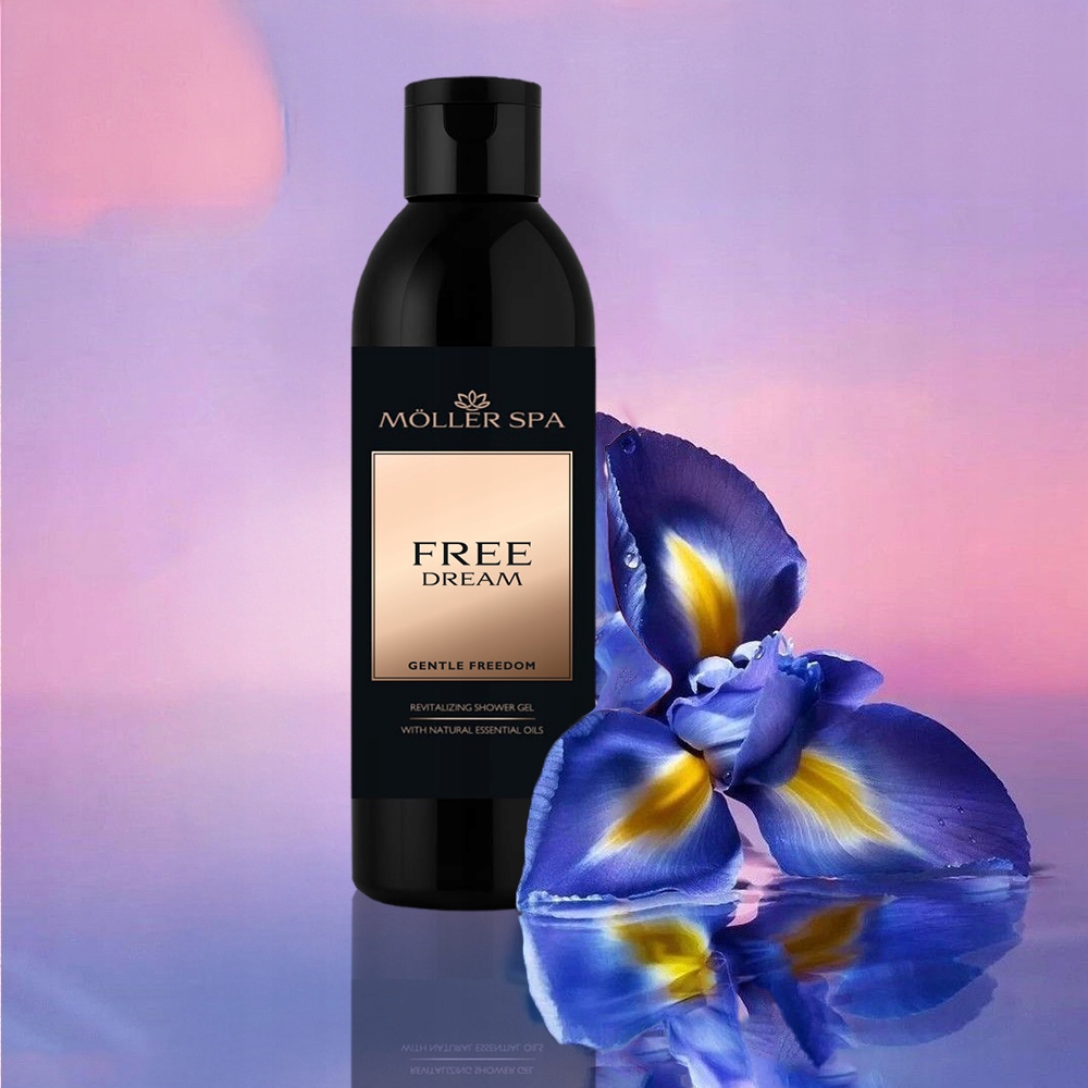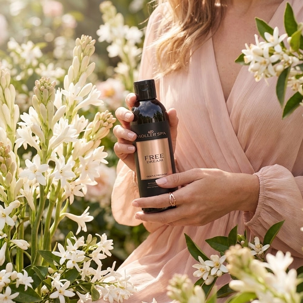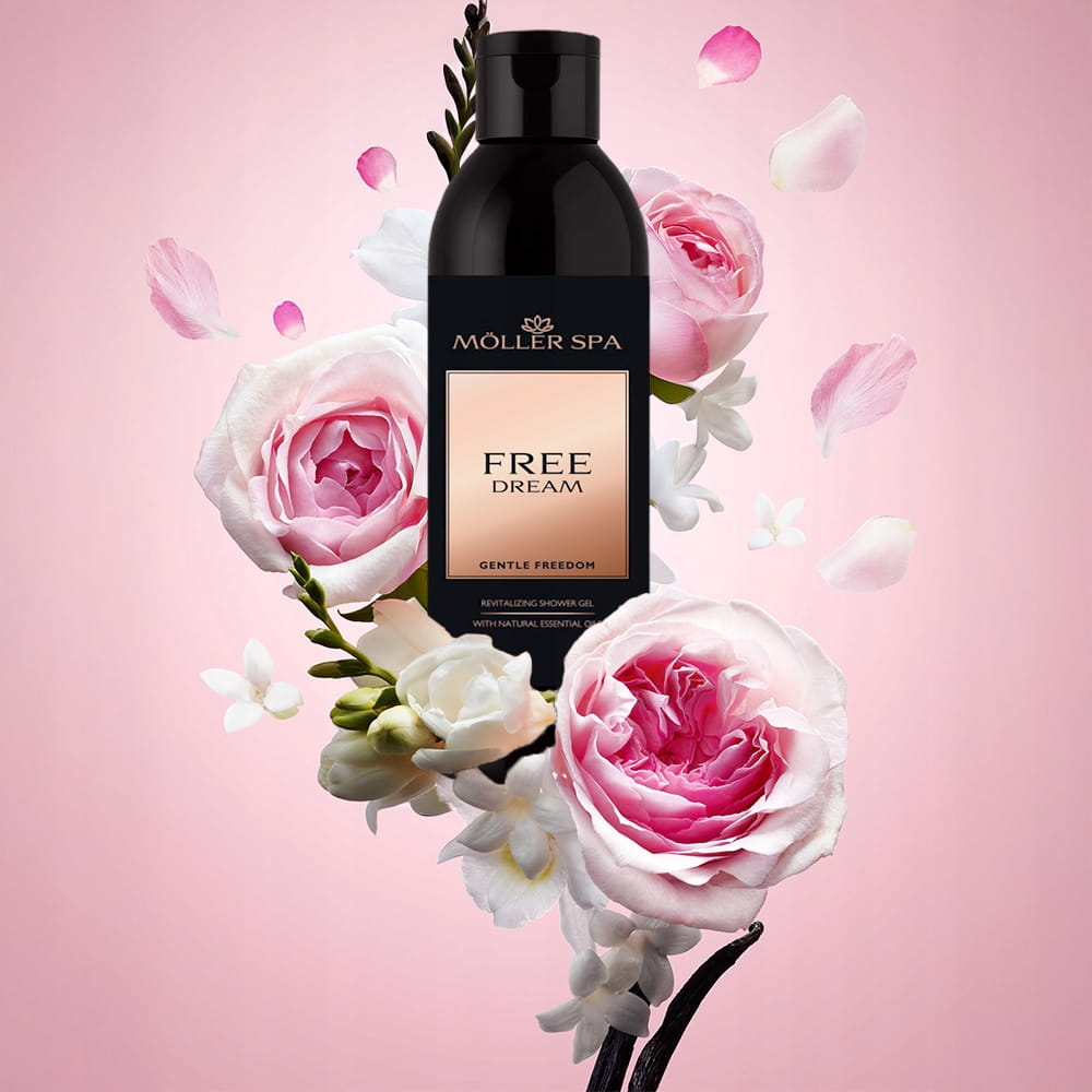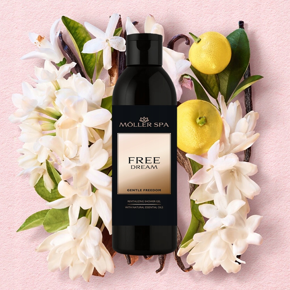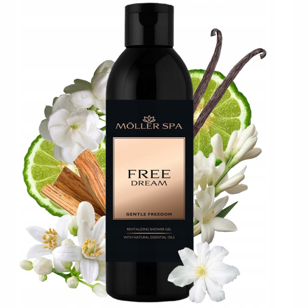 Möller SPA Free Dream – stworzony z myślą o pielęgnacji skóry wrażliwej. Zawarte w żelu ekstrakty i proteiny wspierają nawilżenie oraz odżywienie skóry, pozostawiając ją miękką i elastyczną. Jego świetlista, kwiatowa kompozycja łączy nuty pomarańczowego kwiatu, jaśminu i białych płatków, otulonych delikatną waniliowo-drzewną bazą. Zapach działa harmonizująco, dodaje pewności siebie i towarzyszy przez cały dzień subtelną, kobiecą aurą.