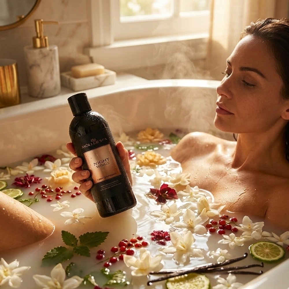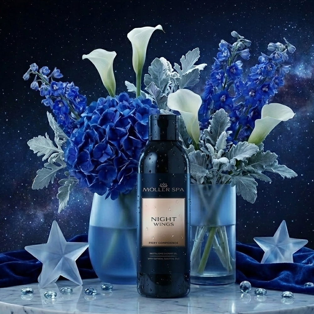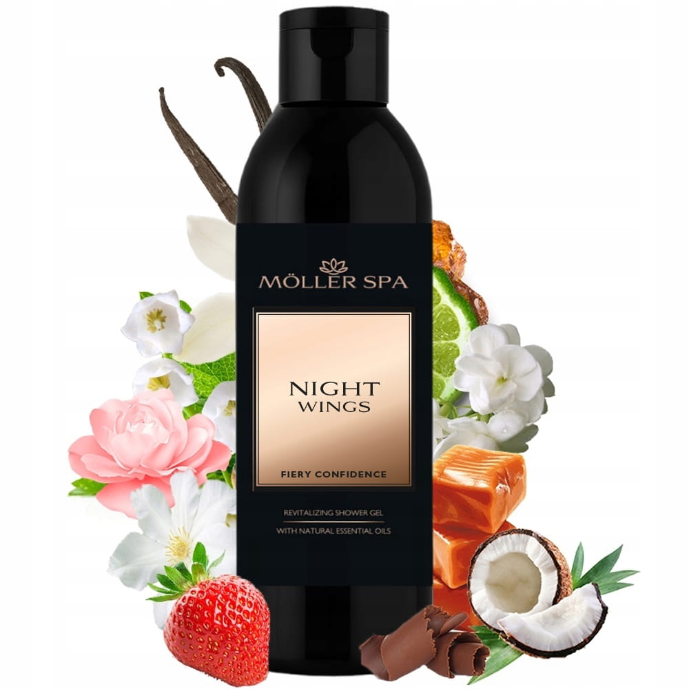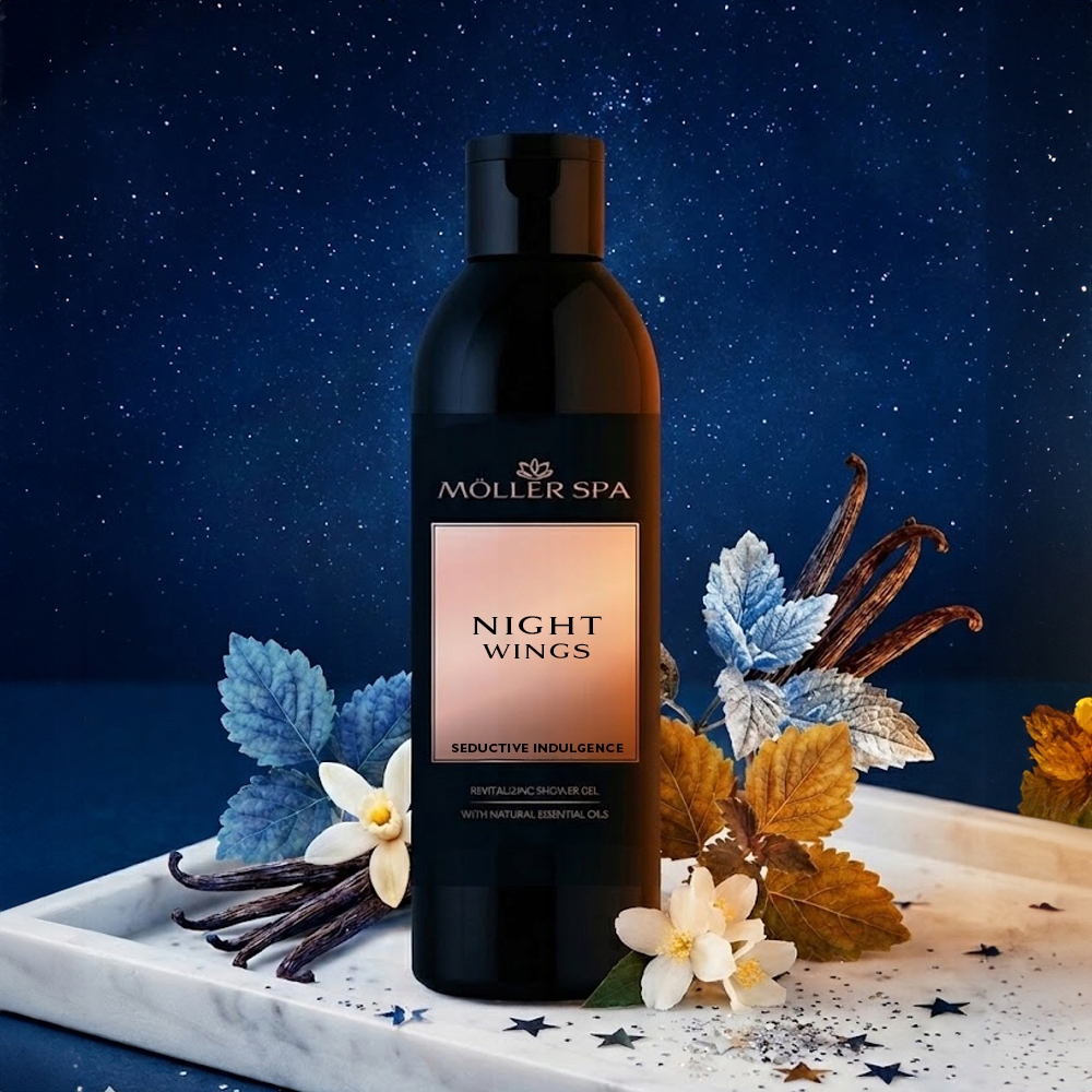 Möller SPA Night Wings – stworzony z myślą o pielęgnacji skóry wrażliwej. Zawarte w żelu ekstrakty i proteiny wspierają nawilżenie oraz odżywienie skóry, pozostawiając ją miękką i elastyczną. Jego głęboka, gourmand-kwiatowa kompozycja łączy słodkie, ciepłe akordy wanilii i praliny z delikatnymi nutami jaśminu, otulonymi charakterystycznym, zmysłowym paczulowym tłem.