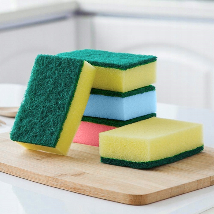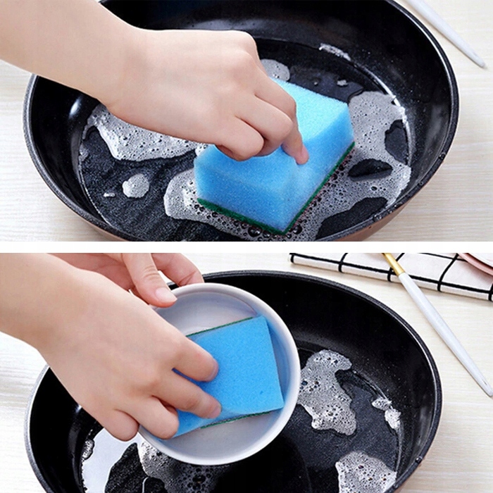 Uniwersalna, praktyczna gąbka do użytku domowego z dwiema stronami, jedną miękką, a drugą szorstką.