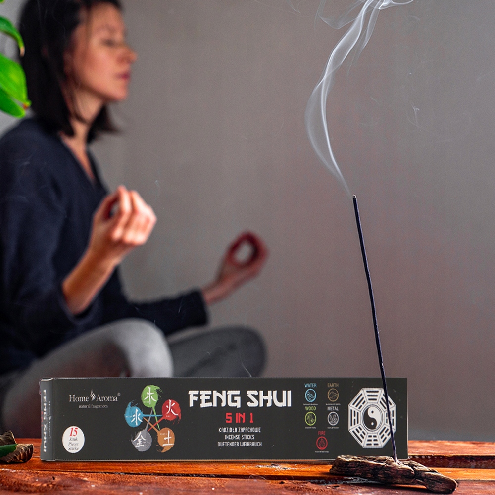 Zapach Feng Shui po połączenie energii 5 żywiołów w jednym patyczku, tworzące harmonię aromatyczną. Otrzymany zapach łączy w sobie cechy filozofii feng shui, pomagając się wyciszyć i zestroić wewnętrznie.