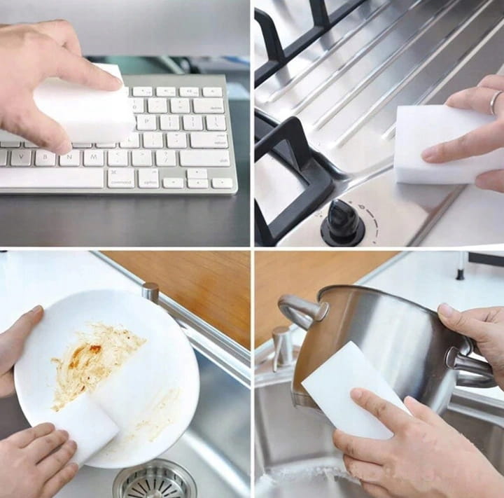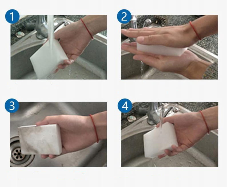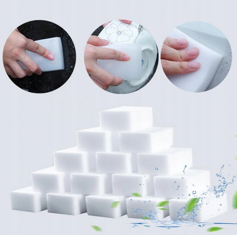 Gąbka skutecznie usuwa zabrudzenia bez użycia chemii. Wystarczy odrobina wody i bez problemu można usunąć ślady po długopisie, flamastrach, kredkach. Gąbka zlikwiduje również brud i zacieki. Wyczyści tapicerkę, szkło, plastik.
