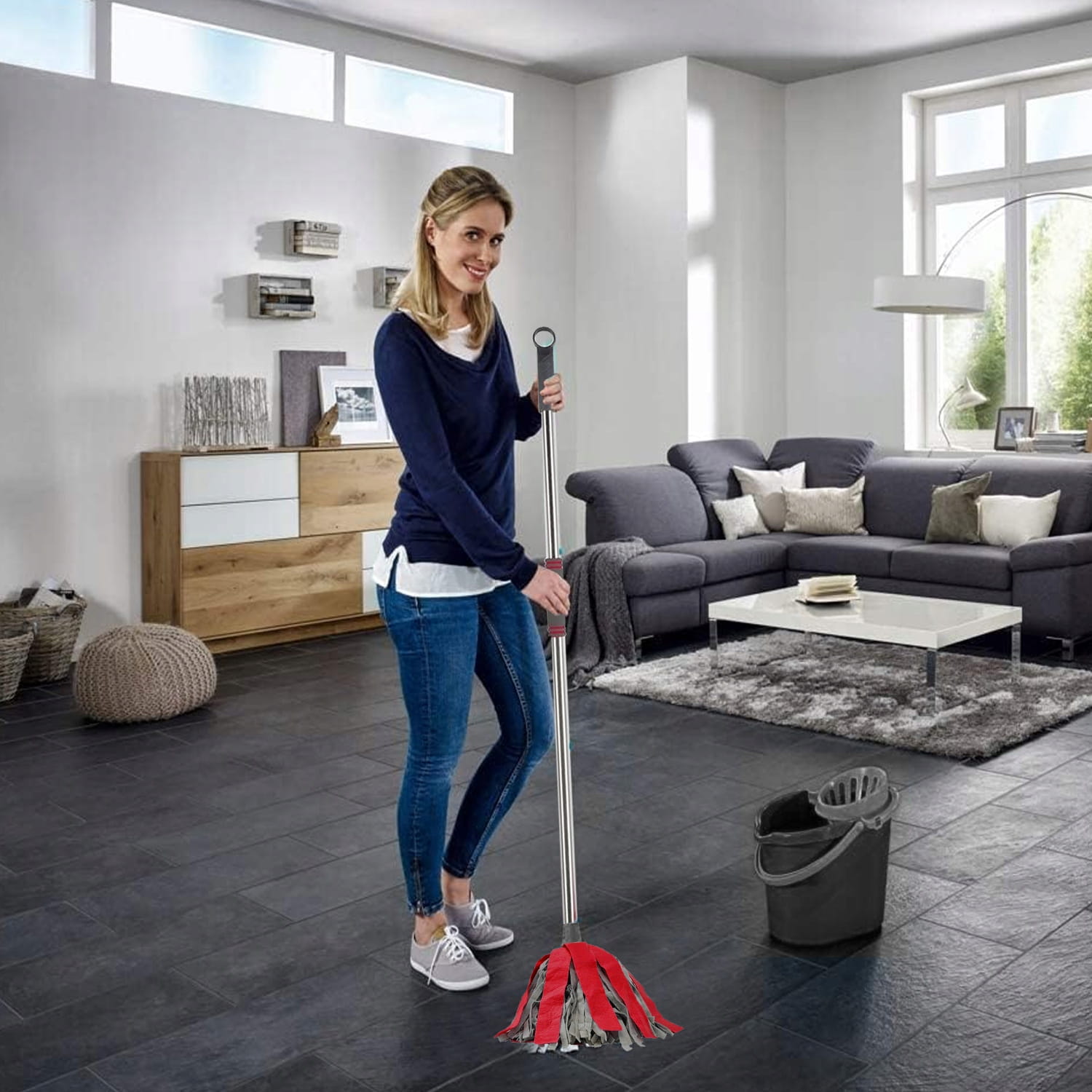 Wyposażony w paskowy wkład oraz solidny drążek, pozwala skutecznie wyczyścić podłogi w domu. Nadaje się do każdego rodzaju podłóg, takich jak płytki, marmur, ceramika, drewno, szkło, podłogi laminowane, beton i kamień.