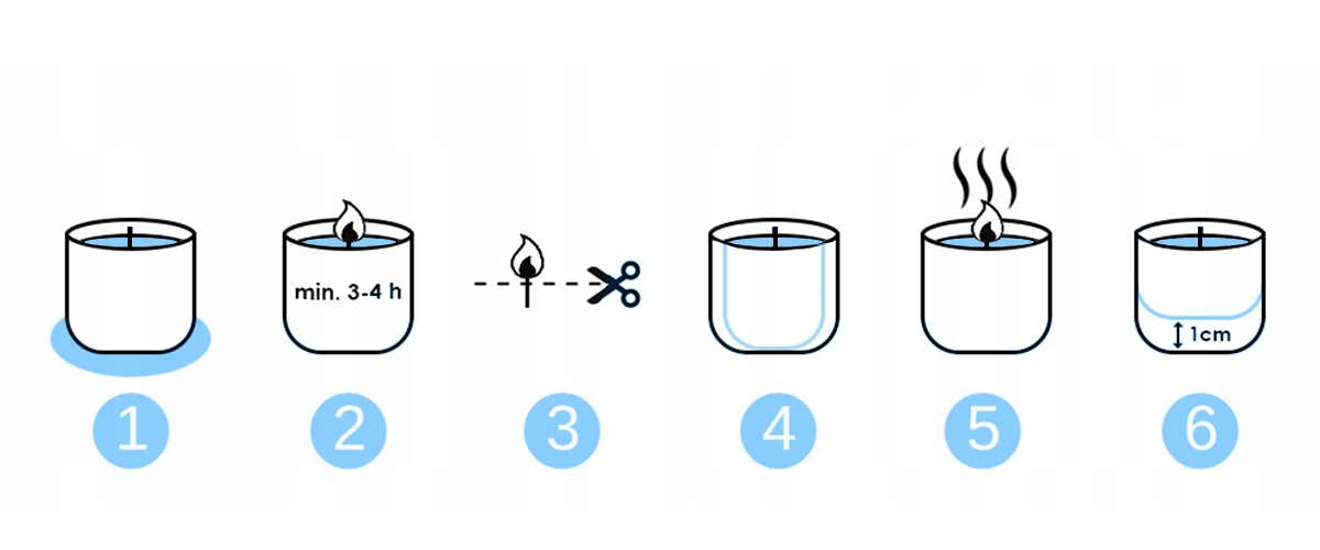 6️⃣ GDY WOSK SIĘ WYTOPI - Aby zachować pełne bezpieczeństwo zakończ palenie świecy, gdy na jej spodzie zostanie około 1cm wosku. Pozostałości wosku na dnie jest zjawiskiem normalnym i pozwala uniknąć uszkodzenia szklanego opakowania.