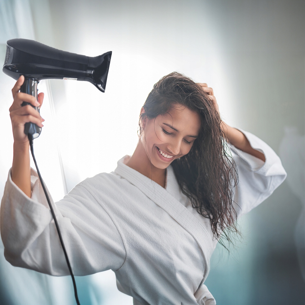 Suszarka o mocy 2200W działa błyskawicznie, skracając czas suszenia i minimalizując ryzyko przesuszenia włosów. Trzy poziomy temperatury i dwie prędkości nawiewu pozwalają dopasować ustawienia do Twoich potrzeb, a wąska dysza koncentrująca powietrze zapewnia precyzyjne modelowanie.