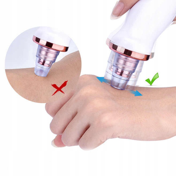 Krok 1: Naładuj urządzenie przed pierwszym użyciem. Dokładnie oczyścić skórę przed zabiegiem, dobrać odpowiednią końcówkę w zależności od potrzeb.