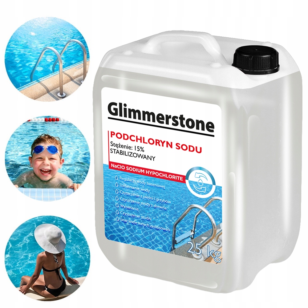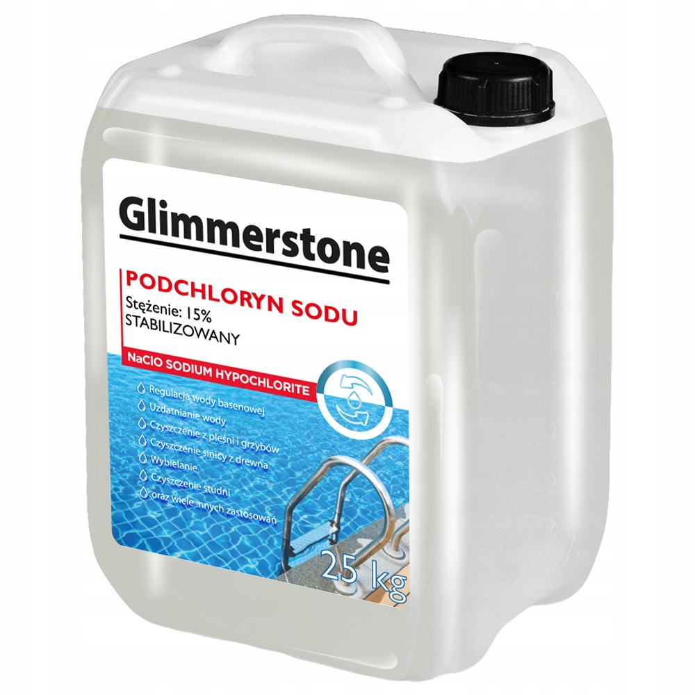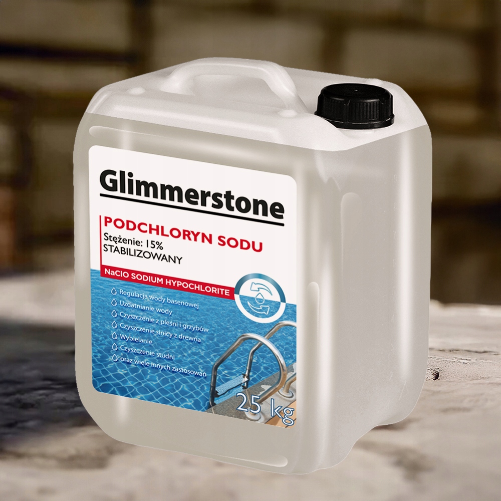 Podchloryn sodu 15% marki Glimmerstone to wysokiej jakości, stabilizowany środek czyszczący i wybielający, przeznaczony do profesjonalnego i domowego użytku.