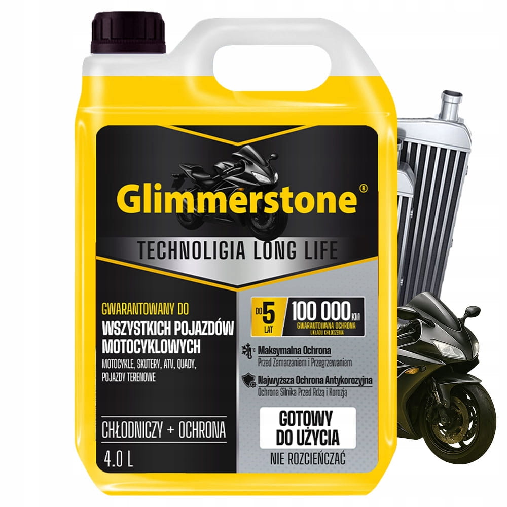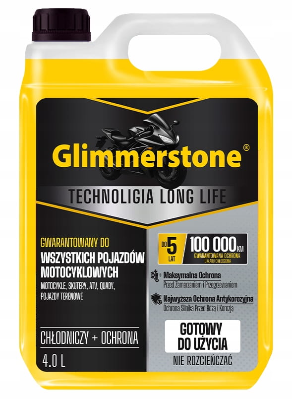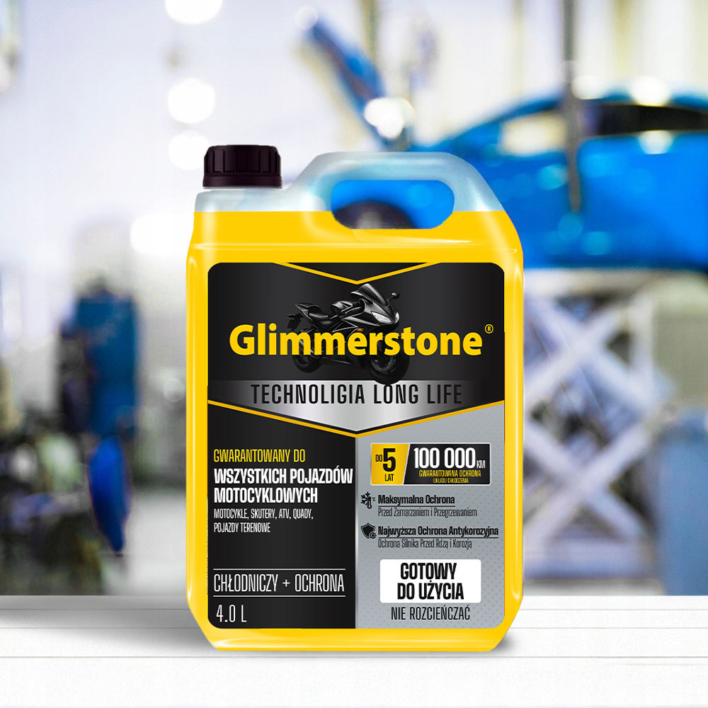 ▶ Płyn chłodniczy Glimmerstone został opracowany specjalnie z myślą o wszystkich pojazdach motocyklowych – motocyklach, skuterach, quadach, ATV oraz pojazdach terenowych do -35°C