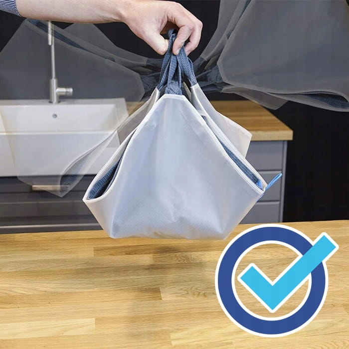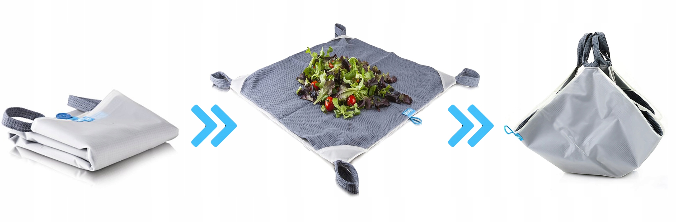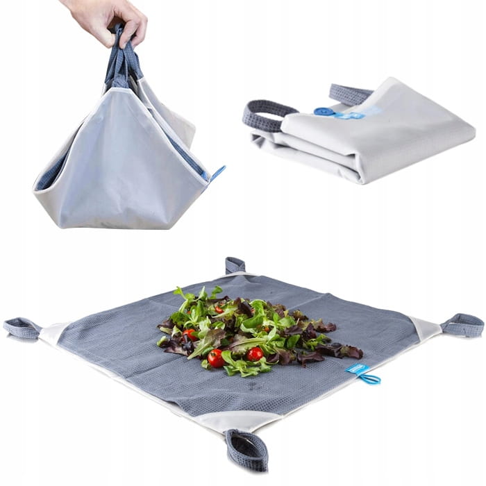 Wystarczy umieścić sałatę, szpinak czy też zioła po środku składanej maty, chwycić za 4 rogi, zakręcić, odlać wodę i gotowe, można już serwować lub złożyć matę wraz z zawartością i umieścić w lodówce. Dwuwarstwowy ręcznik Dry&Store utrzymuje wilgoć w środku zajmując niewiele miejsca a przechowywane w nim warzywa dłużej zachowują świeżość i chrupkość.