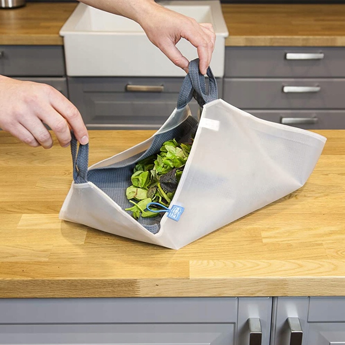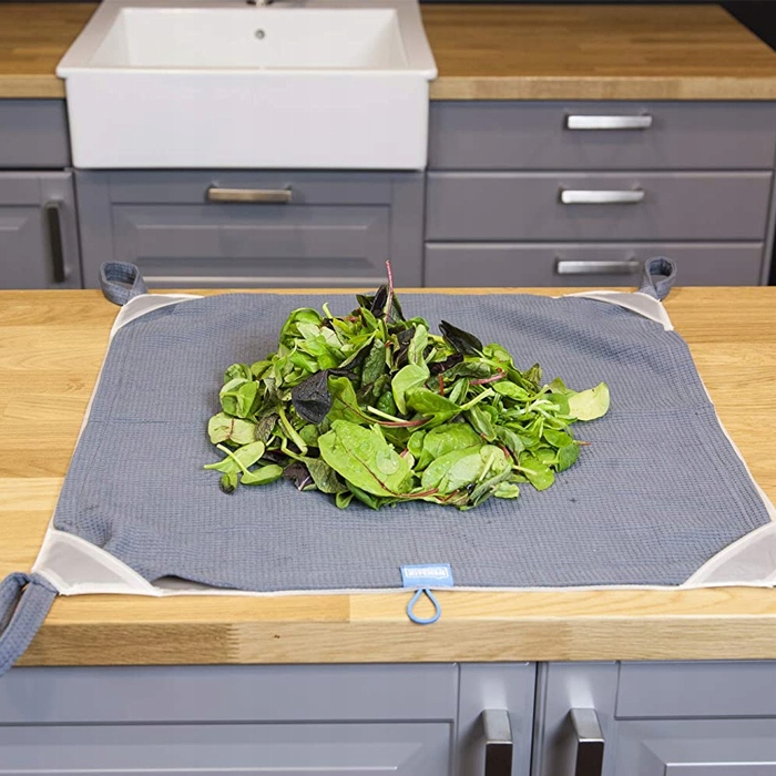 Zamiast klasycznych mis, suszarek czy pojemników, ręcznik do sałaty pozwoli z łatwością odsączyć umyte liście, a przy tym nie zajmuje wiele miejsca.