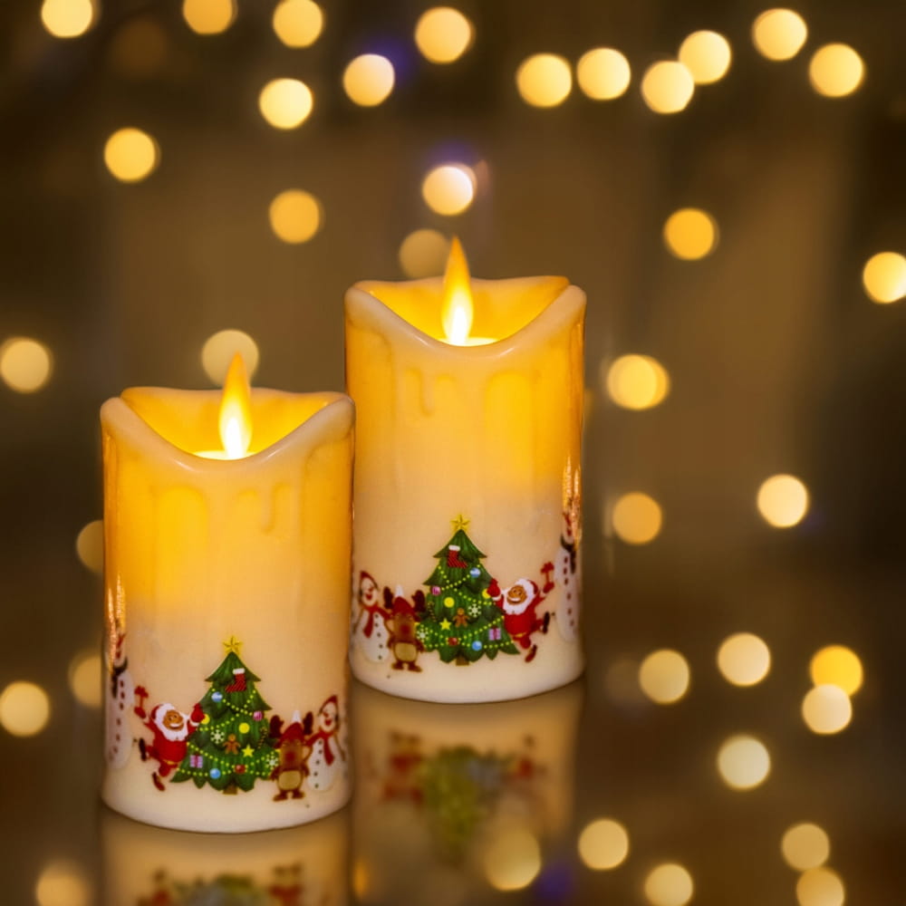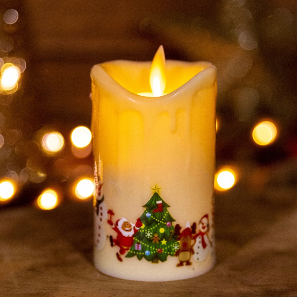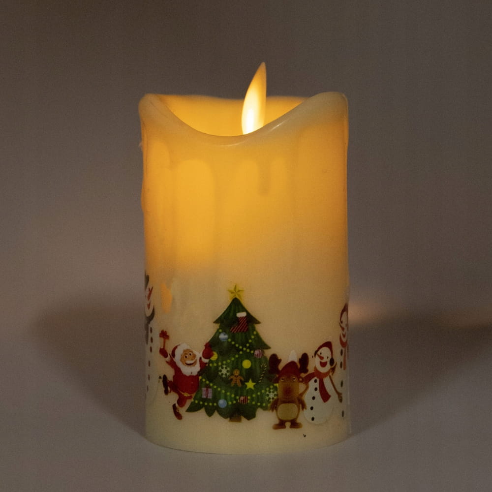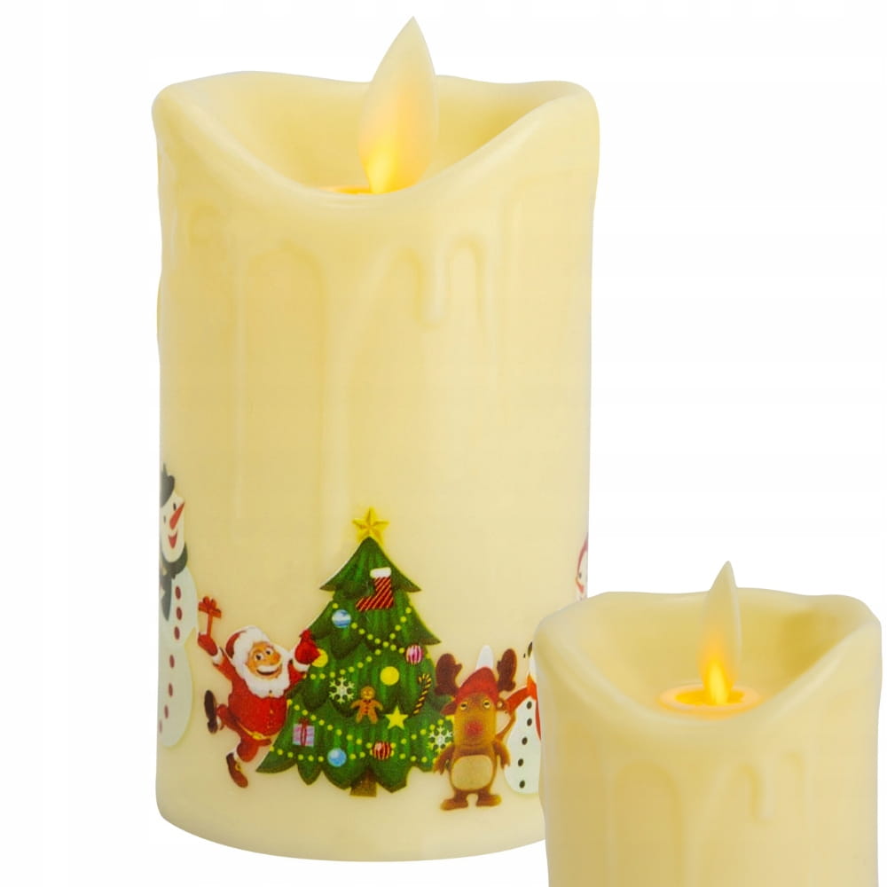 Nasza świeca LED to doskonała imitacja prawdziwej woskowej świecy, z dodatkowym akcentem bożonarodzeniowych ilustracji. Na krawędziach świecy widoczny jest realistycznie odwzorowany efekt kapiącego wosku, co podkreśla jej elegancki wygląd.