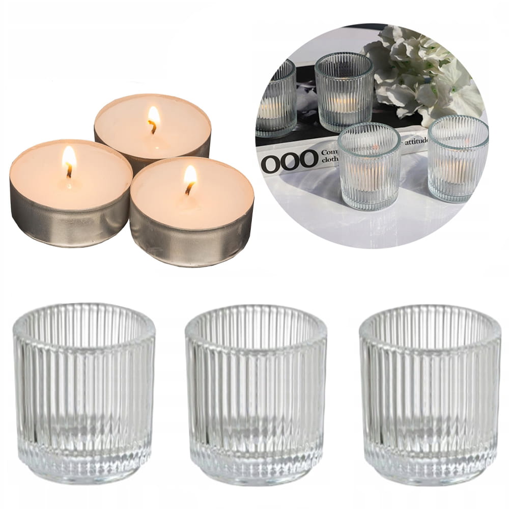 ŚWIECZNIK NA TEALIGHT ZESTAW 3 SZTUK SZKLANY RYFLOWANE + ŚWIECZKI PREMIUM
