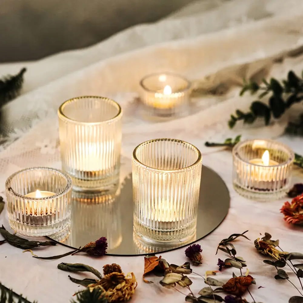 Płomień świecy odbijający się w ryflowanej powierzchni szkła tworzy przyjemne i relaksujące światło, które wprowadza ciepło i intymność do pomieszczenia.
