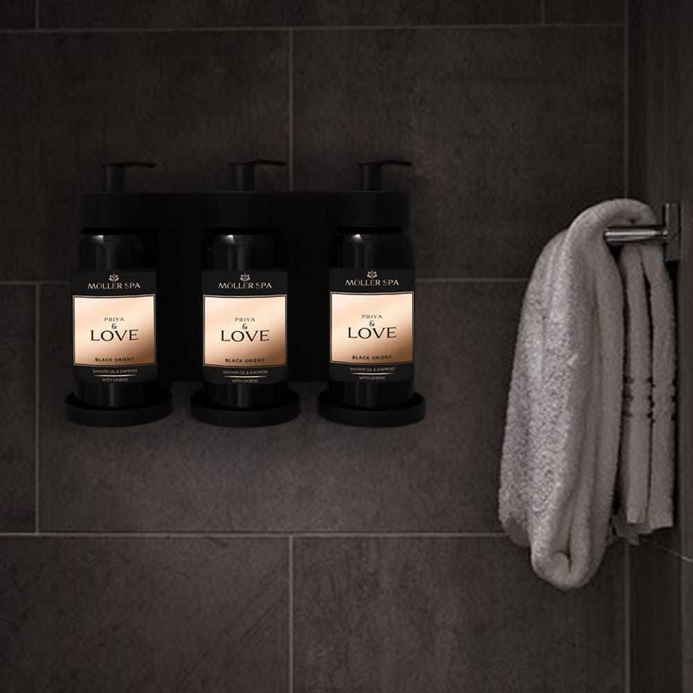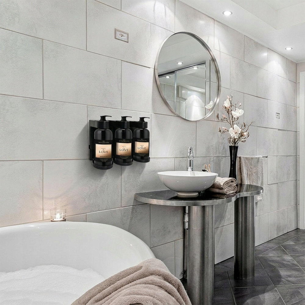 Konstrukcja umożliwia stabilne i estetyczne umieszczenie kosmetyków, zapewniając wygodny dostęp do produktu oraz utrzymanie porządku w przestrzeni użytkowej. Dozownik doskonale sprawdza się w obiektach hotelowych, strefach SPA, łazienkach oraz innych przestrzeniach o podwyższonym standardzie, gdzie liczy się funkcjonalność, higiena i spójny wygląd wyposażenia.