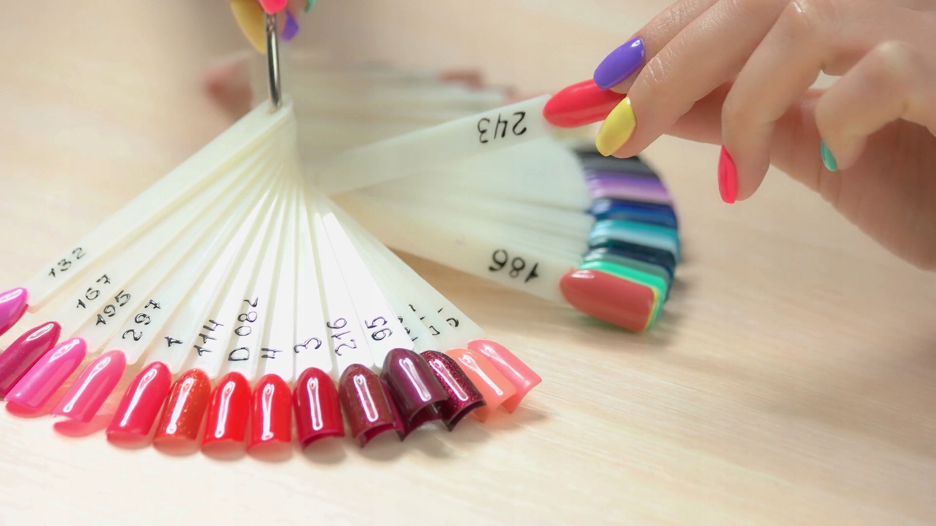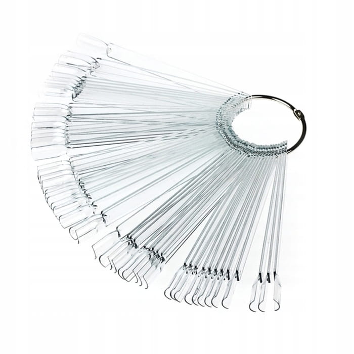 Wszystkie wzorniki w tym modelu są zawieszone na srebrnym kole, dzięki czemu można swobodnie dołożyć pomalowany paznokieć do dłoni swojej Klientki i sprawdzić czy kolor będzie odpowiedni.