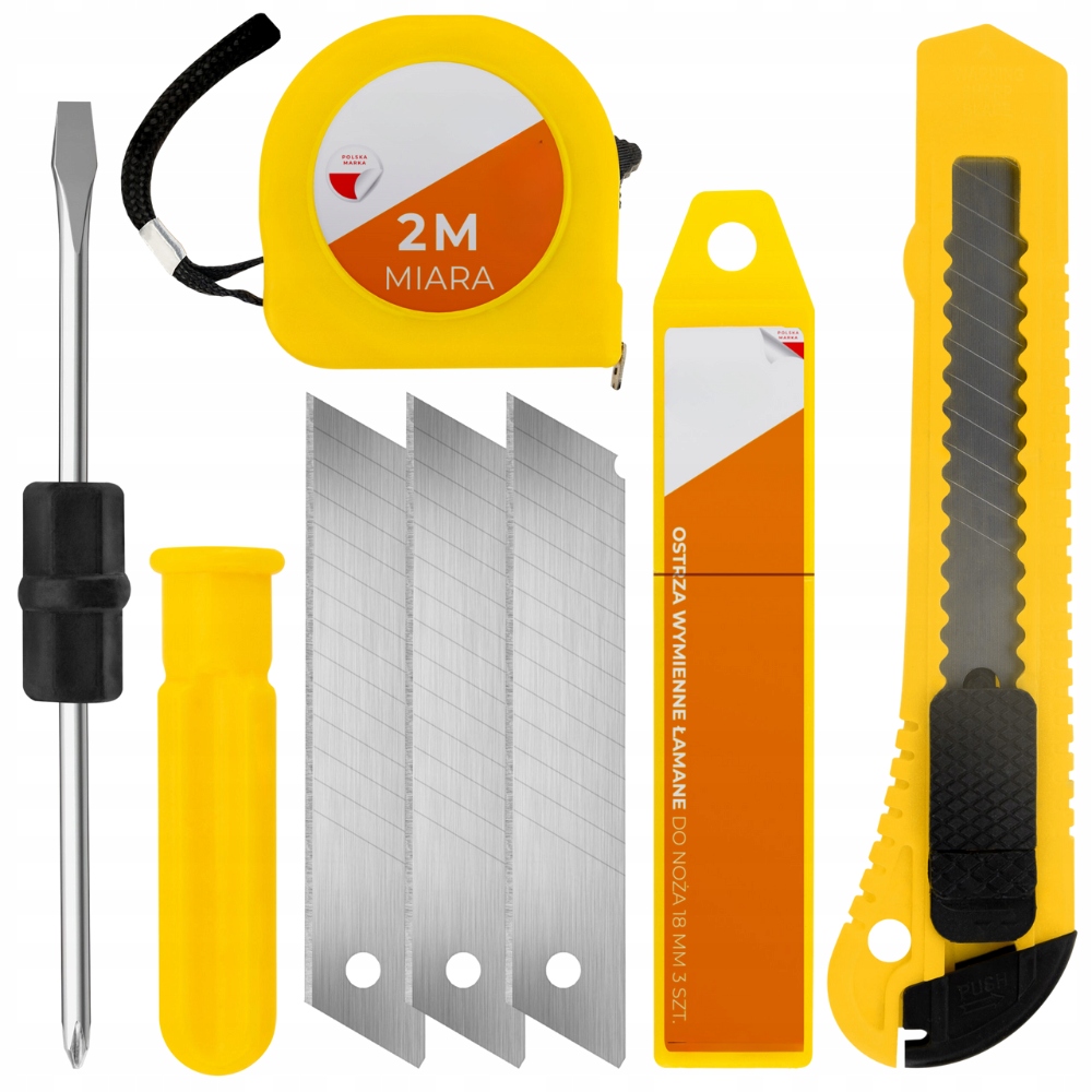 ZESTAW NARZĘDZIOWY MIARKA ŚRUBOKRĘT NOŻYK NÓŻ TAPECIAK OSTRZE ZAPAS