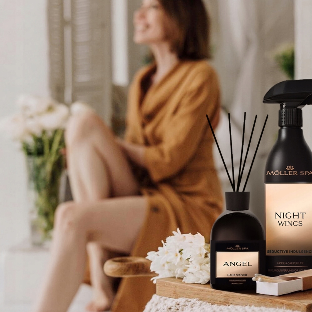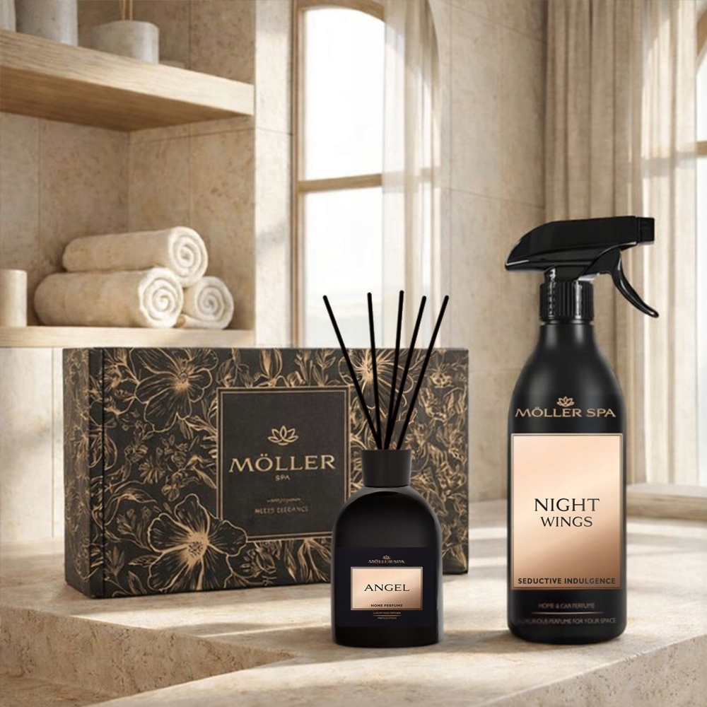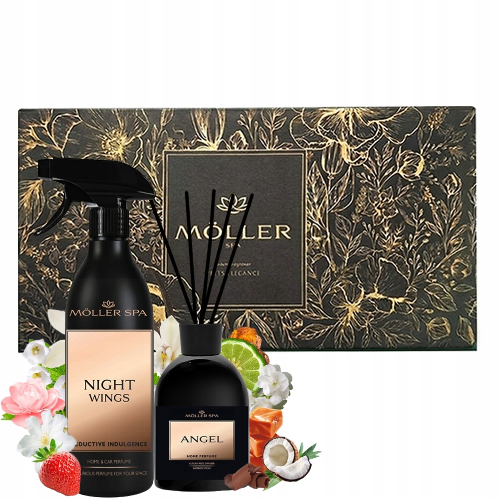 ZESTAW PREZENTOWY Möller SPA perfumy do wnętrz i pomieszczeń 500ml + dyfuzor zapachowy 250 ml Night Wings inspirowane perfumami ANGEL + OZDOBNE PUDEŁKO