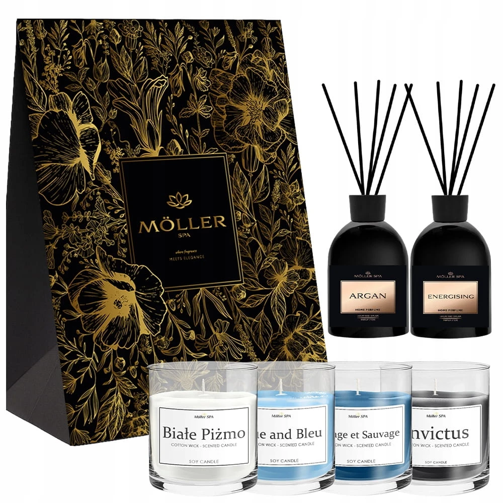 Delikatny płomień świecy otula wnętrze ciepłym blaskiem, a dyfuzory wypełniają przestrzeń kojącym aromatem, które pobudzają zmysły i przynoszą ukojenie. Każdy element zestawu został starannie dobrany, aby wspólnie tworzyć atmosferę spokoju, odprężenia i luksusu, którą możesz cieszyć się każdego dnia.